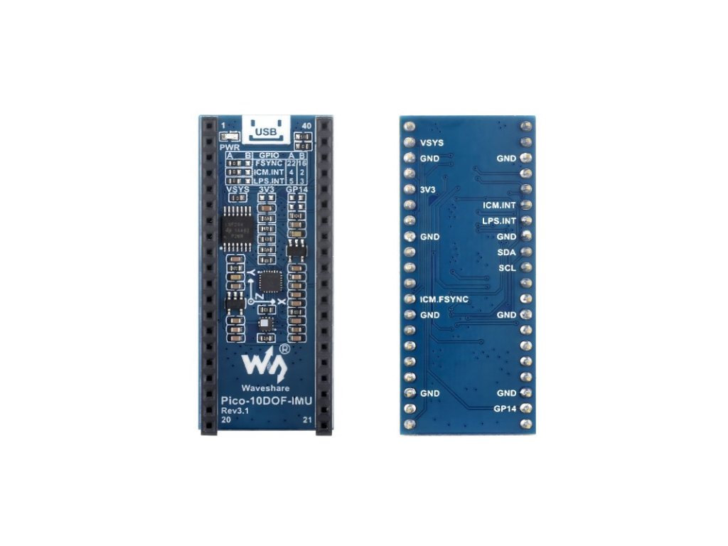 The Pico-10DOF-IMU is an IMU sensor expansion module specialized for Raspberry Pi Pico. It incorporates sensors including gyroscope, accelerometer, magnetometer, baroceptor, and uses I2C bus for communication.