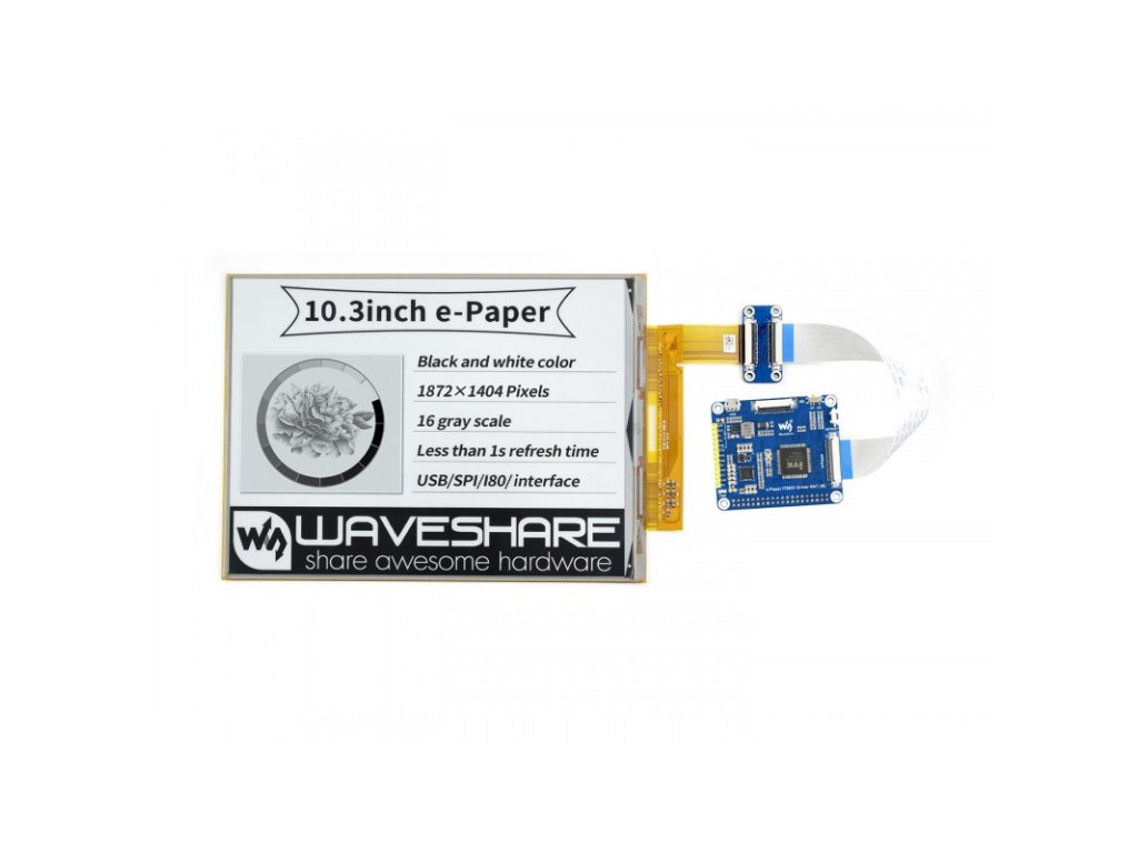 This is a flexible E-Ink display HAT for Raspberry Pi, 10.3inch, 1872×1404 resolution, with embedded controller IT8951, communicating via USB/SPI/I80 interface, supports partial refresh.