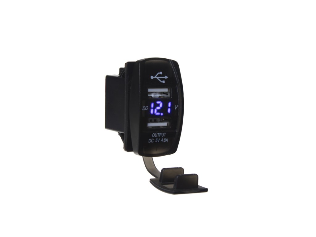 2x USB nabíjačka s voltmetrom v prevedení ROCKER, s krytkou proti prachu a vlhkosti, modrý LED displej.Technické parametre