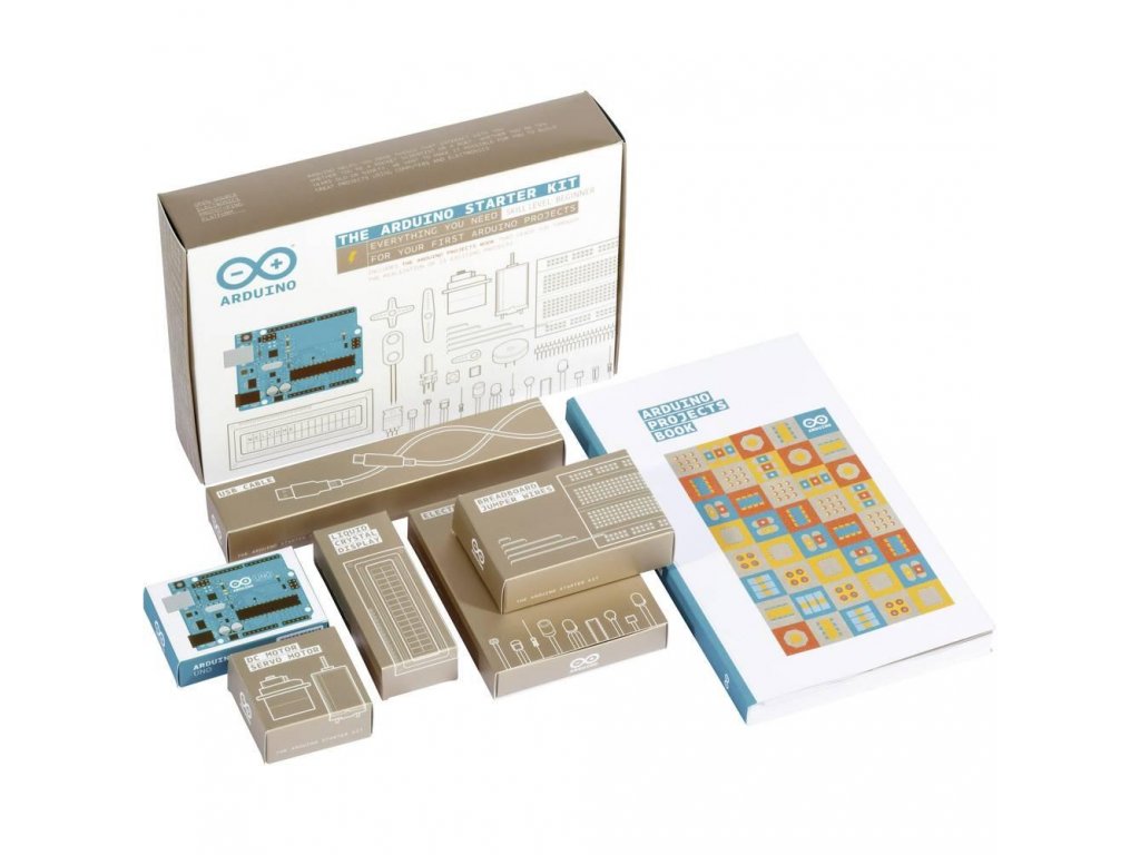 Arduino Starter Kit originál PopisArduino Starter Kit je kompletná sada pre zoznámenie sa so základmi elektroniky a vyskúšanie možností platformy Arduino. Vďaka pripraveným súčiastkam budete môcť rýchlo navrhnúť vlastné projekty a ihneď ich realizovať. V balení sa nachádzajú základné vstupné a výstupné periférie, vďaka ktorým je možné zoznámiť sa s elektronikou na skutočných projektoch.Mikrokontrolér:Arduino UNO R3 ATmega328P (originál)Frekvencia: 16 MHzPamäť: 32 KB, 0,5 KB použité bootloaderomSRAM: 2 kBEEPROM: 1 kBVstupy a výstupy:14 x digitálny vstup/výstup (sériový port, externé prerušenie, PWM)6 x analógový vstupObsah balenia:1 x Arduino UNO rev. 31 x kniha s projektmi (170 strán v anglickom jazyku)1 x USB kábel1 x Nepájivé kontaktné pole1 x zostaviteľný drevený stojanček1 x konektor pre batérie 9V70 x prepojovací drôtik2 x prepojovacie lanko6 x fotorezistor VT90N2 LDR3 x potenciometer 10k10 x tlačidlo1 x teplotný senzor TMP361 x senzor náklonu1 x alfanumerický LCD displej (16 x 2 znaky)1 x DC motorček 6/9 V1 x servo motor1 x Piezo menič PKM17EPP-4001-B01 x H-mostík L293D pre riadenie motora2 x optočlen 4N355 x tranzistor BC5472 x mosfet tranzistor IRF5205 x dióda 1N40071 x ulamovacia lišta s pinmirezistory (20 x 220R; 5 x 560R; 5 x 1k; 5 x 4,7 k; 20 x 10k; 5 x 1M; 5 x 10M)kondenzátory (5 x 100 nF; 3 x 100 uF; 5 x 100 pF)LED diódy (1 x biela; 1 x RGB; 8 x červená; 8 x zelená; 8 x žltá; 3 x modrá)