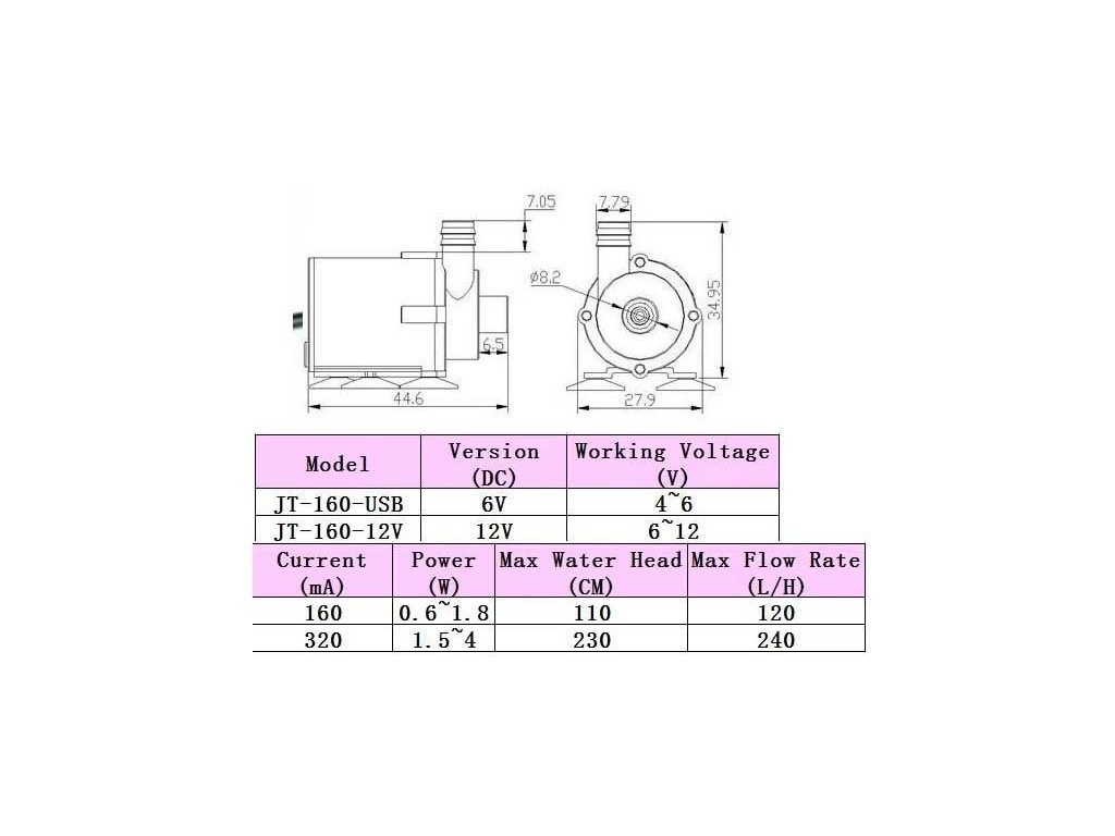 JT-160A je miniatúrne bezkartáčové DC vodné čerpadlo s napájaním 5V cez USB. Ponúka prietok 150 l/h a je ideálne na malé vodné obehové systémy, akváriá, fontánky alebo DIY projekty. Má nízku spotrebu energie, tichý chod a dlhú životnosť vďaka bezkartáčovej konštrukcii.