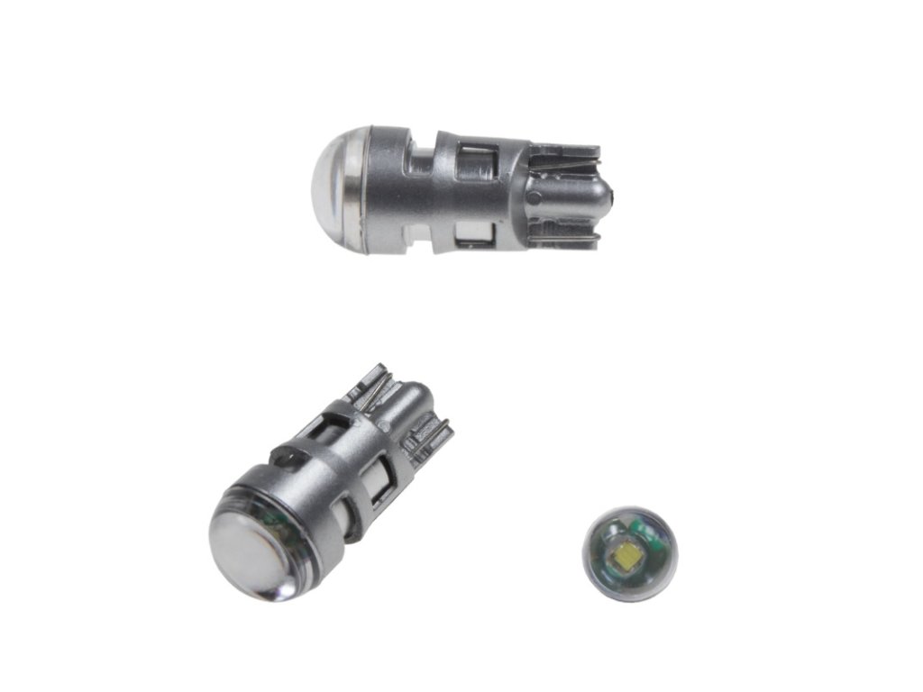 Náhradná LED žiarovka s päticou T10, 1x LED čip CREE 5W + rozptylová krycia šošovka, vhodná do parkovacích svetiel pri novších vozidlách. Vďaka teplote svetla 6000 K sú LED žiarovky ideálnym doplnkom do reflektorov s xenónovými výbojkami, kde žlté svetlo obyčajnej žiarovky pôsobí rušivo.