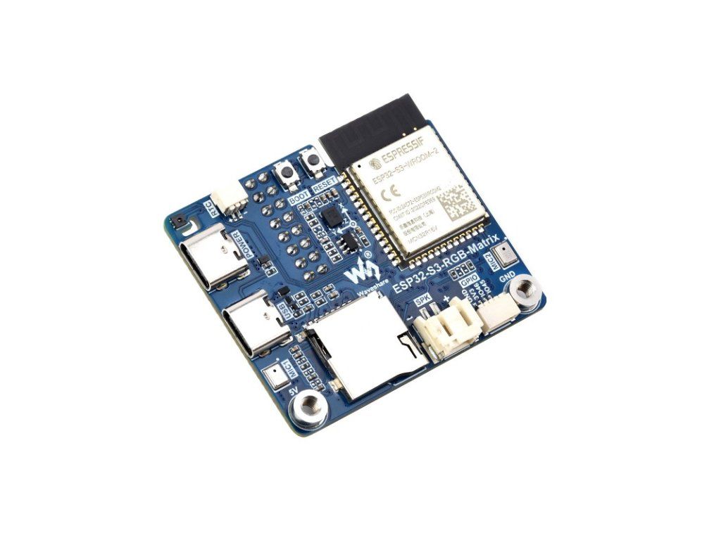 ESP32 -S3-RGB-Matrix je vysoko výkonná, vysoko integrovaná doska ovládača pre maticové LED panely navrhnutá spoločnosťou Waveshare. Je vhodná pre maticové RGB panely s rozhraním HUB75 a súvisiace vstavané aplikácie. Je založená na mikrokontroléri ESP32-S3 a integruje veľkokapacitnú flash pamäť, čip RTC, IMU, slot pre TF kartu, nízkonapäťový audio kodek, duálne mikrofóny atď. Poskytuje tiež rezervované rozhrania, ako sú USB, UART, I2C a GPIO, čo ponúka silnú škálovateľnosť a umožňuje používateľom rýchlo ju vyvíjať a integrovať do praktických aplikácií.