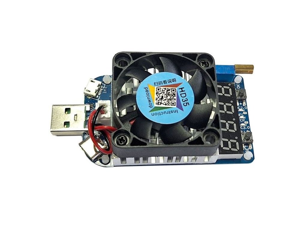 HD35 je elektronický zaťažovací rezistor USB s výkonom až 35 wattov. Aktuálny prúd je možné pohodlne odčítať cez LCD displej. Zariadenie má navyše nastaviteľný trimr a je schopné simulovať rôznu nabíjaciu elektroniku ako QC2.0, QC3., FCP a AFC9V. S maximálnym napätím 25 V a maximálnym prúdom 5 A je vhodný takmer pre každú oblasť použitia. Zabudovaný chladič v spojení s teplotne riadenou ventilátorovou jednotkou zaisťuje efektívne chladenie celého zariadenia. Integrované tlačidlo možno použiť aj na rýchlu a jednoduchú aktiváciu alebo deaktiváciu nakonfigurovanej záťaže.
