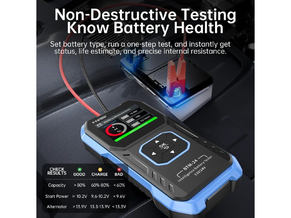 - Komplexná diagnostika : Meria napätie, vnútorný odpor, stav nabitia (SoC), stav batérie (SoH), hodnotenie CCA a výkon záťaže.