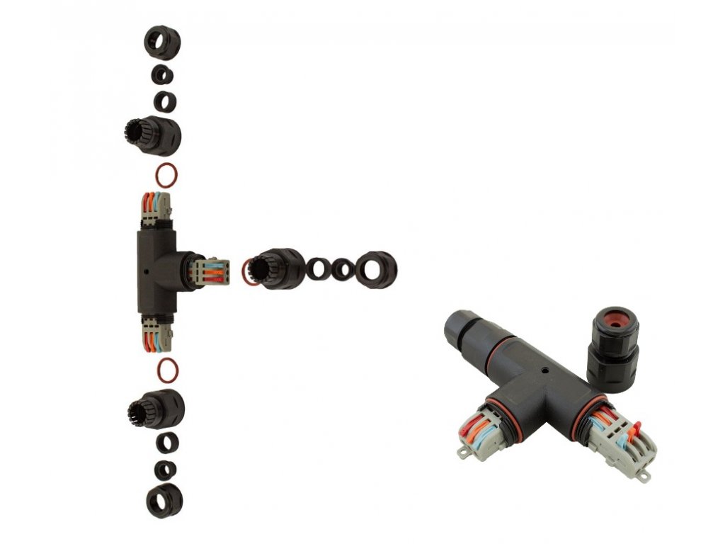 Káblová spojka IP68, typ T, 3x2.5mm2; 250V, 16A, bezskrutková rýchlosvorka
