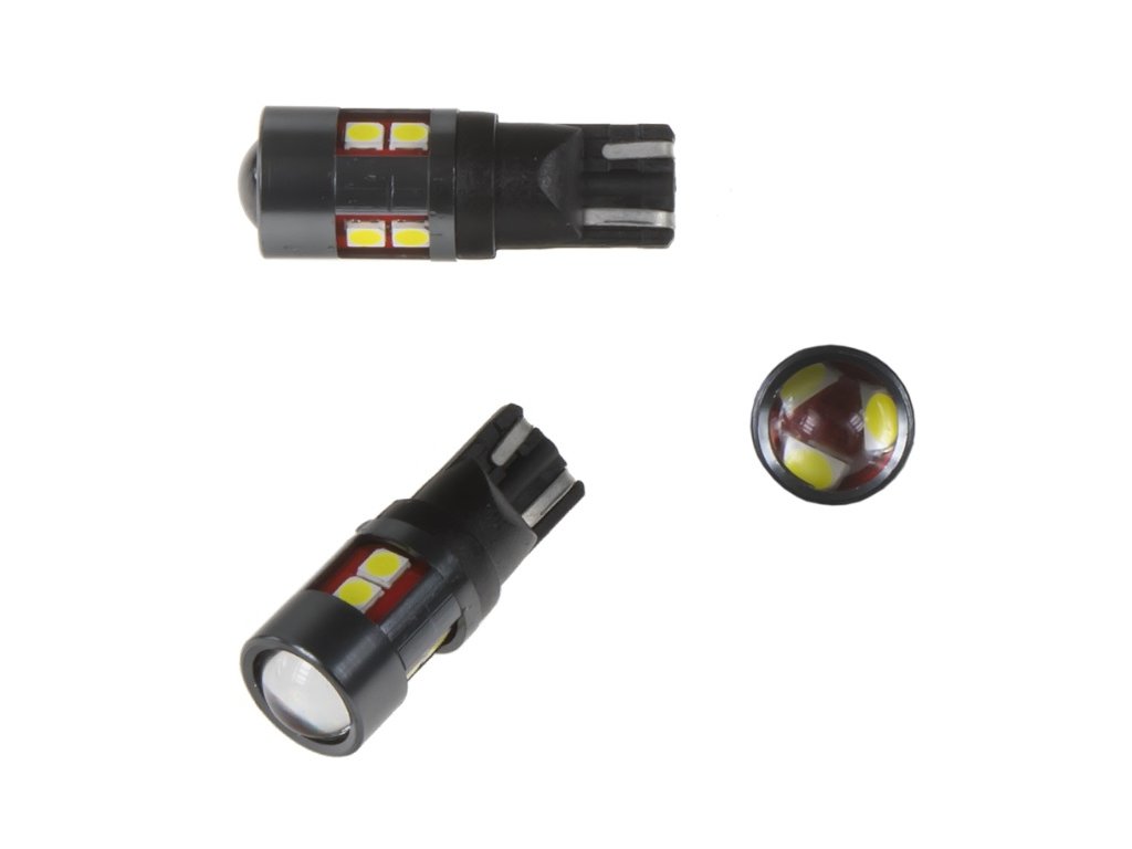 Náhradná LED žiarovka s päticou T10, biela, 12x vysokosvietivé SMD LED diódy 2016SMD, vhodná do parkovacích svetiel pri starších vozidlách. Svietivosť LED diódy je väčšia pri žiarovke 12 V 5 W. Vďaka teplote svetla 6000 K sú LED žiarovky ideálnym doplnkom do reflektorov s xenónovými výbojkami, kde žlté svetlo obyčajnej žiarovky pôsobí rušivo.