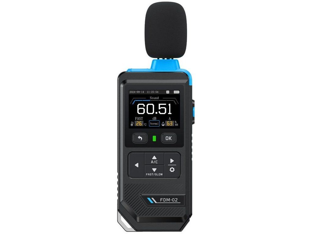 FNIRSI FDM-002 meria hladiny hluku v rozsahu 30–130 dBs presnosťou ±1,5 dB pri 1 kHz. Umožňuje výber váhových filtrov A/C na zabezpečenie meraní zodpovedajúcich ľudskému sluchu (A) alebo technickým meraniam ©. Ponúka dve rýchlosti odozvy – FAST (125 ms) pre rýchle zmeny a SLOW (1 s) pre priemerné hodnoty.