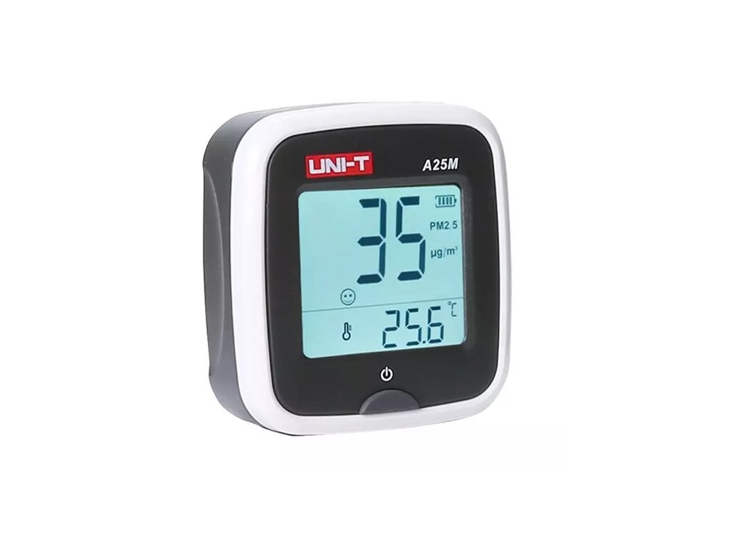 A25M je prenosný merač častíc PM2,5, ktorý možno použiť v domácnostiach, kanceláriách, vozidlách, laboratóriách, kanceláriách, hoteloch, školách, továrňach, konferenčných miestnostiach, na letiskách, v nemocniciach, reštauráciách, nákupných centrách a na mnohých ďalších verejných miestach. Meria koncentráciu týchto častíc v mikrogramoch na meter kubický. Na podsvietenom dipleji LCD zobrazuje túto koncentráciu v μg/m³ a tiež v šiestich úrovniach pomocou emotikonov. Krátkym stlačením tlačidla vypínača môžete zapnúť alebo vypnúť biele podsvietenie displeja. Štandardne je podsvietenie automaticky zapnuté pri zapnutí prístroja. Ak prekročí koncentrácia častíc štandard (PM 2,5>115μg/m³), rozsvieti sa červené podsvietenie. Akonáhle sa koncentrácie častíc vráti k normálu (PM2,5 ≤ 115μg/m³), červené podsvietenie sa automaticky vypne (zmení na biele). Ak prekročenie koncentrácie častíc PM 2,5> 115μg/m³ trvá dlhú dobu, môžete kvôli úspory batérie, vypnúť červené podsvietenie manuálne, krátkym stlačením tlačidla vypínača. Na displeji sa taky zobrazuje orientačná hodnota teploty.