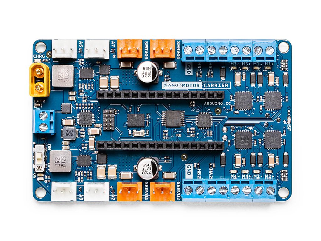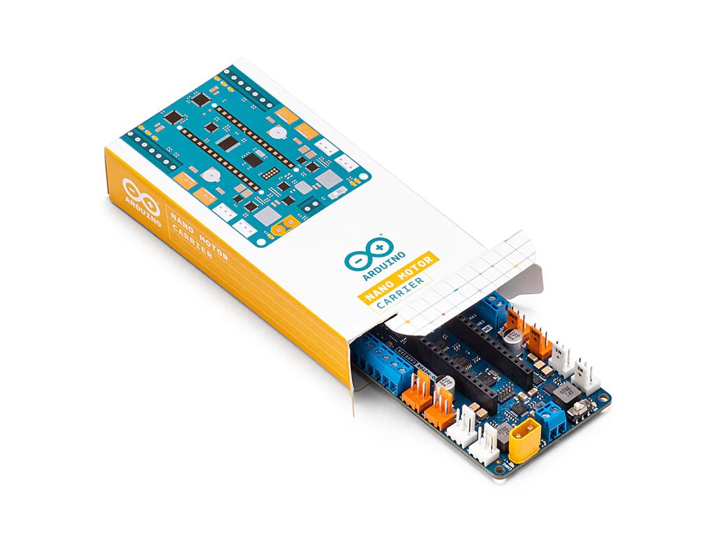 Nano Motor Carrier je doplnková doska navrhnutá tak, aby rozšírila funkcionalitu dosky nano-riešenia (napr. Arduino Nano 33 IoT) o možnosť riadiť motory a zároveň poskytovala integrované senzory a podporu napájania batériou. Doska obsahuje motorové ovládače, vstupy pre enkodéry, nabíjací obvod pre Li-Ion batériu a ďalšie vývody pre senzory či akčné členy. Vďaka tomu je veľmi vhodná pre prototypovanie robotiky, pohybových projektov alebo iných aplikácií, kde je potrebné pridať motorový pohon a snímanie pohybu/spínanie.