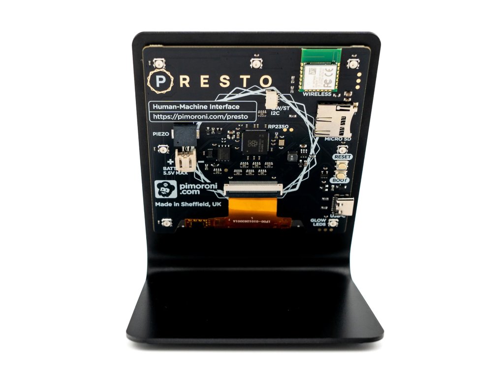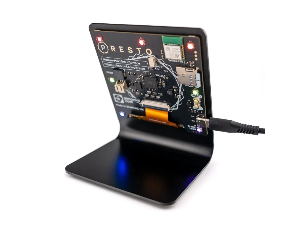 Je vybavený chutným, plnofarebným 4-palcovým štvorcovým dotykovým IPS displejom , ktorý v sebe skrýva všetok výkon nového čipu RP2350 od Raspberry Pi. Skrýva sa tu aj skvelé 7-zónové RGB ambientné osvetlenie , piezo reproduktor pre upozornenia, slot pre SD kartu pre rozšírenie úložiska a konektor pre batériu , takže môžete Presto napájať bez toho, aby ste ho museli pripájať k USB. Má tiež vstavaný bezdrôtový modul RM2 pre bezdrôtové pripojenie 2,4 GHz .
