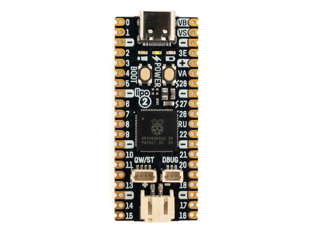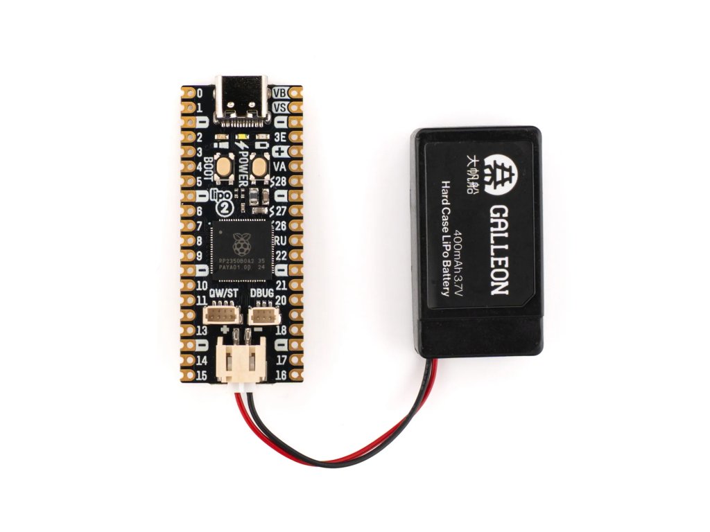 Špičková doska s procesorom RP2350 od značky Pirate, 16 MB flash pamäte, 8 MB PSRAM, USB-C, Qw/ST a vstavaným nabíjaním LiPo batérií.