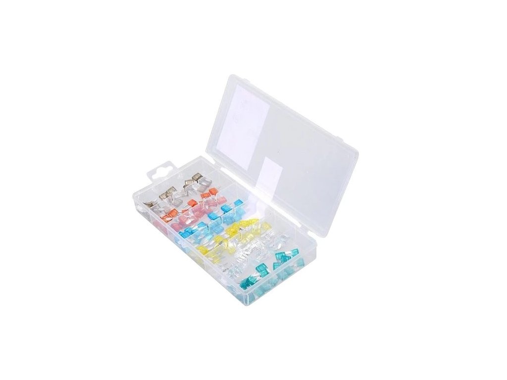 Praktické uzatvárateľné balenie automobilových nožových poistiek MINI. Celkom 120 poistiek v prehľadnom, priehradkami opatrenom kufríku. Poistky sú určené pre napätie do 24 V a sú certifikované, materiál zinok v kombinácii s plastom.