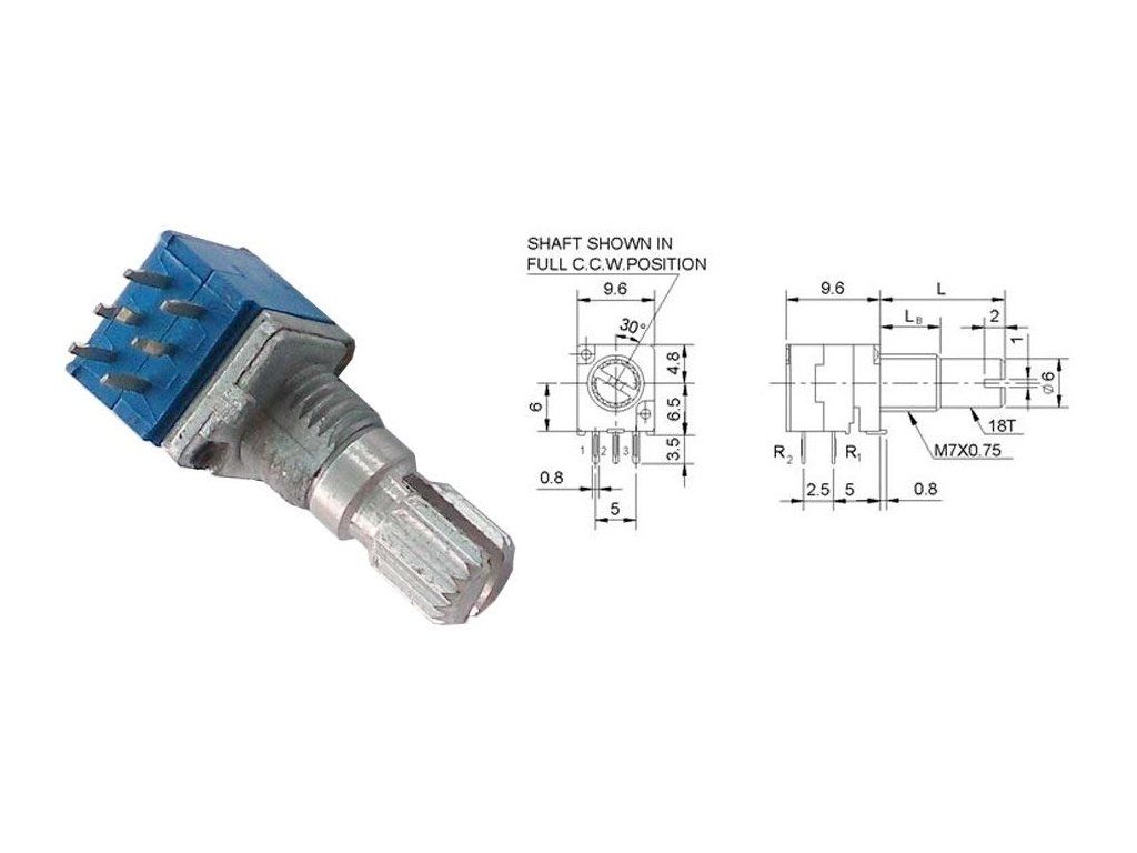 Potenciometer otočný tandemový 50k/G x2, WH9011A, hriadeľ 6x15mm