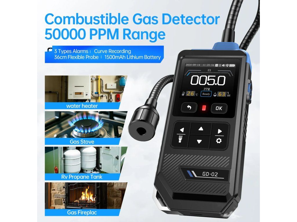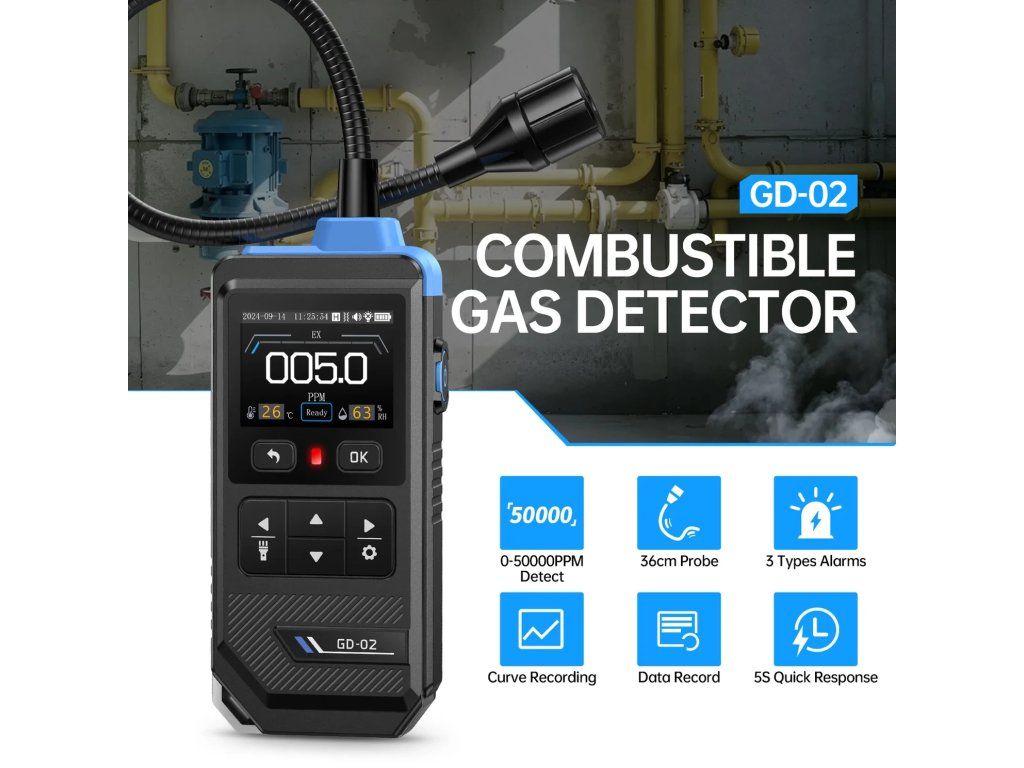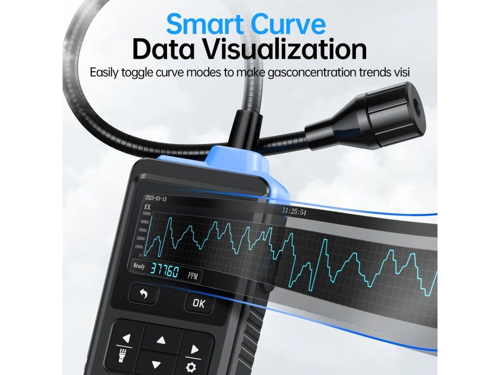 ◉ Flexibilná 36 cm sonda – Ľahko detekuje plyn v úzkych alebo ťažko dostupných priestoroch.