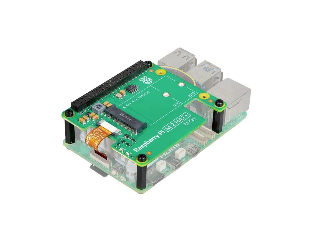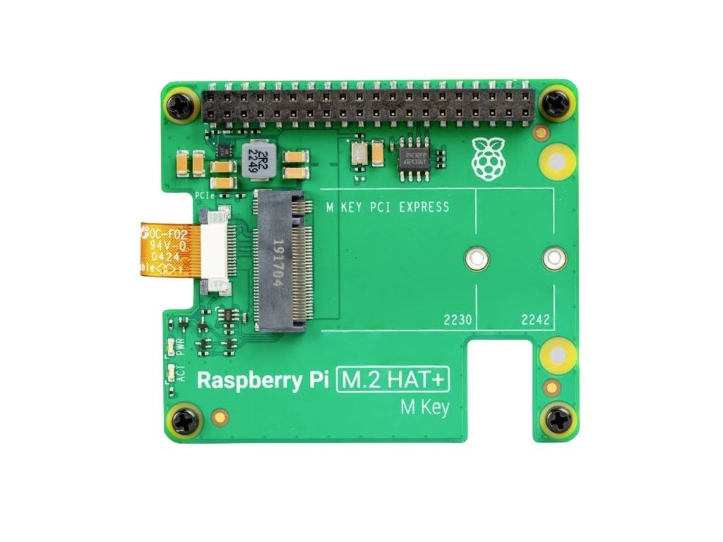 Jednopásmové rozhranie PCI Express 2.0 počítača Raspberry Pi 5 je vystavené na 16pinovom konektore FPC s rozstupom 0,5 mm; M.2 HAT+ M Key je adaptérová doska, ktorá prevádza medzi týmto konektorom a podmnožinou štandardu M.2. Podporuje zariadenie s konektorom M.2 M key edge továrenské formy 2230 a 2242. Pripojeným zariadením M.2 dokáže dodávať prúd až 3A.