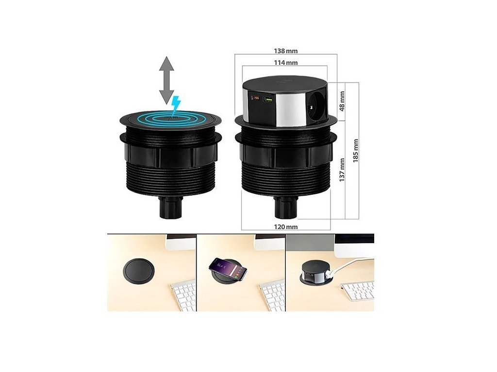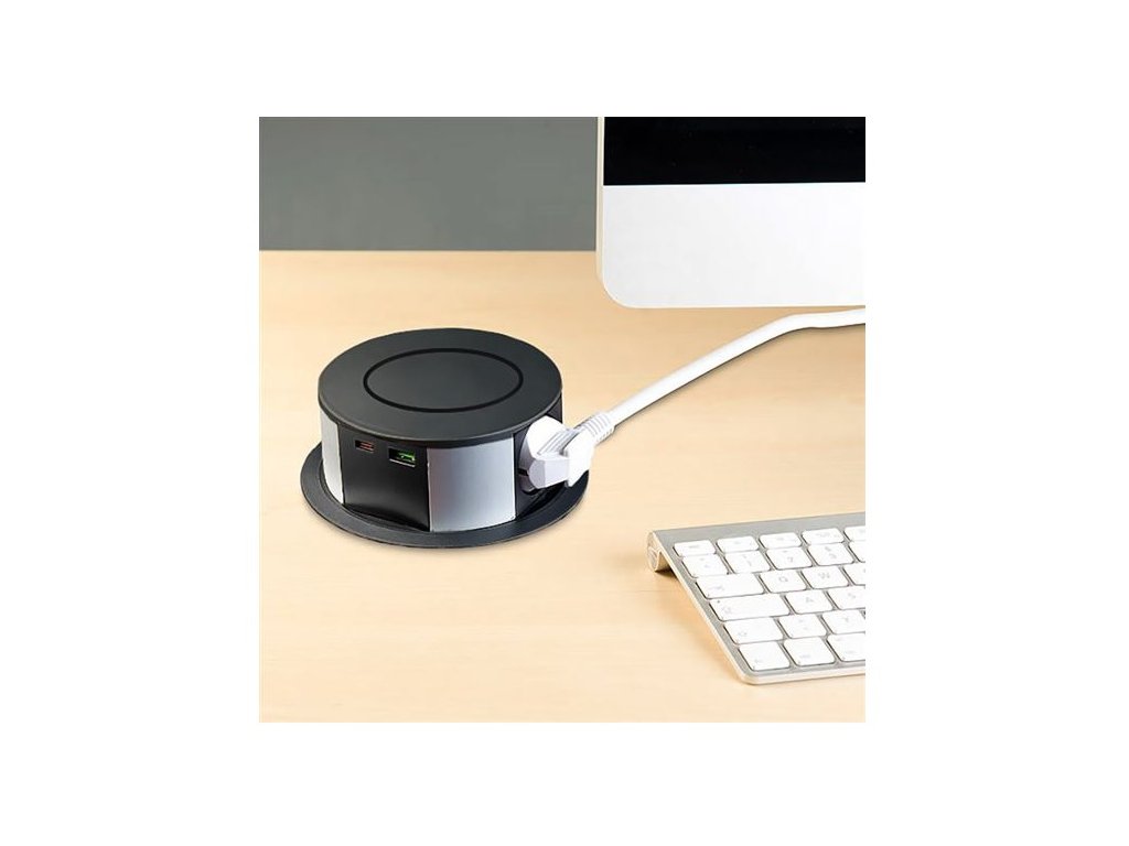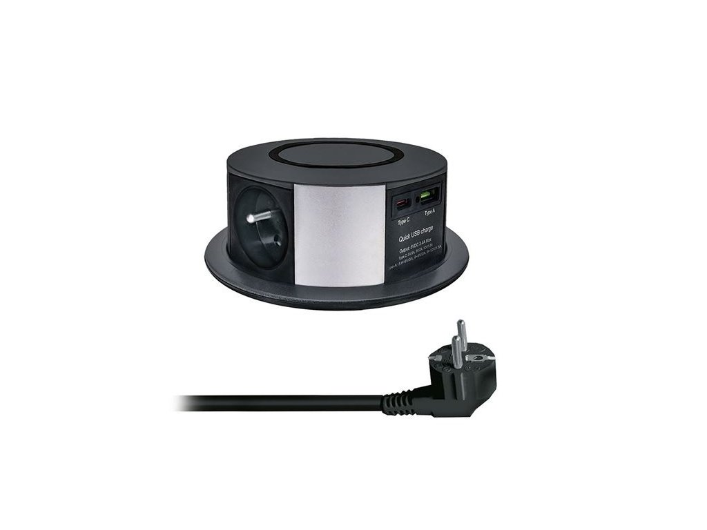 Solight 3z + USB A+C 20W PD, Wireless 10W, výsuvný blok zásuviek, 2m, čierny
