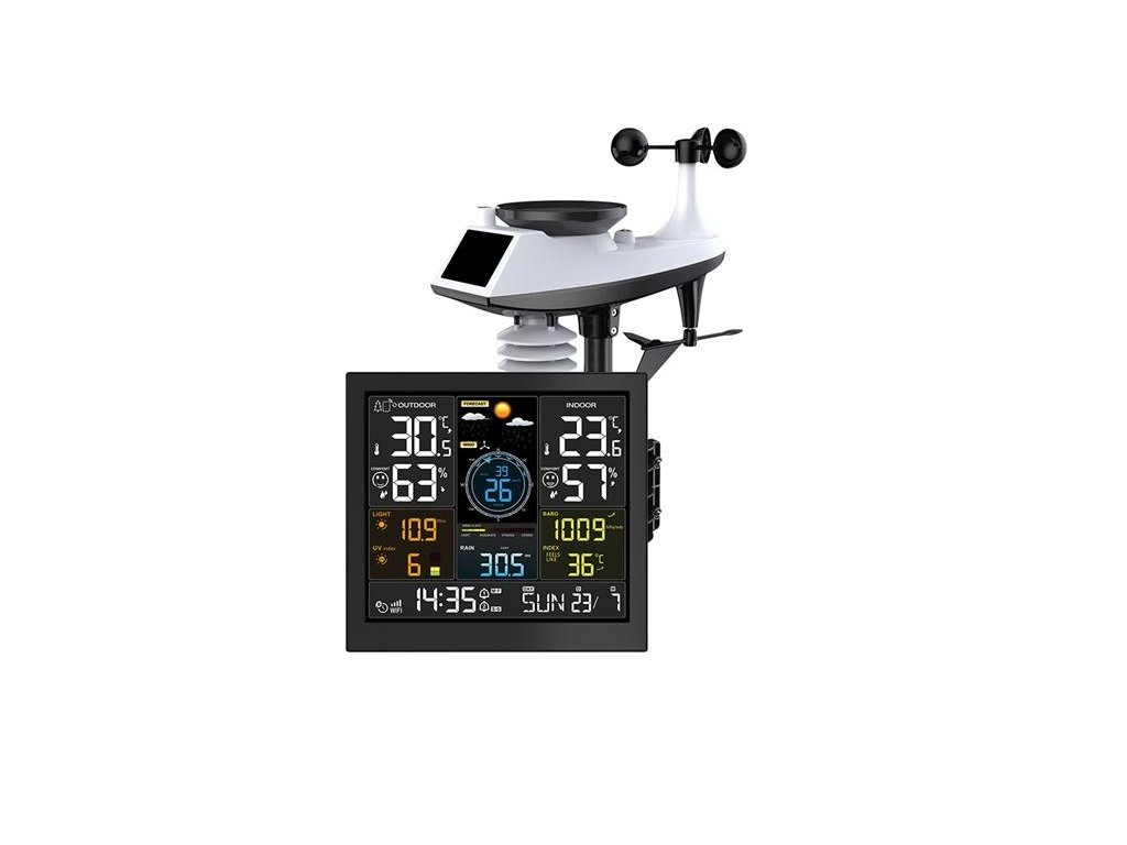 Táto profesionálna meteorologická stanica s veľkým 24,4 cm displejom ponúka pripojenie WiFi a pripojenie k aplikácii Tuya/Smart Life na zobrazenie aktuálnych údajov a štatistík. Meria vnútornú (-20 °C až 50 °C) a vonkajšiu teplotu (-40 °C až 70 °C), vlhkosť (20 % až 95 %), rýchlosť vetra (0 až 180 km/h), smer vetra (0-359°), zrážky (0 až 9999 mm), atmosférický tlak (600-1100 hPa), intenzitu svetla (0-128 klux) a UV index (0-15). Ponúka automatickú synchronizáciu času, zobrazenie dňa v týždni v 15 jazykoch, dva denné budíky s funkciou odloženia (5-60 min alebo vypnutie) a kalendár do roku 2099. Dvanásťhodinová predpoveď počasia využíva tlak vzduchu a zobrazuje ikony ako slnečno, zamračené, dážď alebo sneh. Bezdrôtové snímače s dosahom až 100 m umožňujú pripojenie 1× multikombinovaného snímača a až 3 snímačov teploty/vlhkosti. Napájanie adaptérom DC 5V/1A + 2× záložná batéria AA, snímače na batérie AAA. Vďaka možnosti pripojenia k aplikácii, širokému rozsahu meraní a presnému spracovaniu je ideálnou voľbou pre každého, kto chce mať meteorologické údaje neustále po ruke.