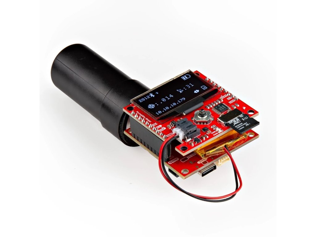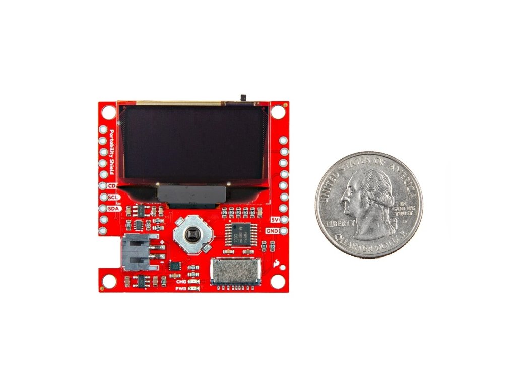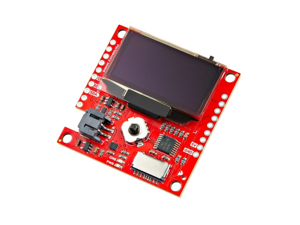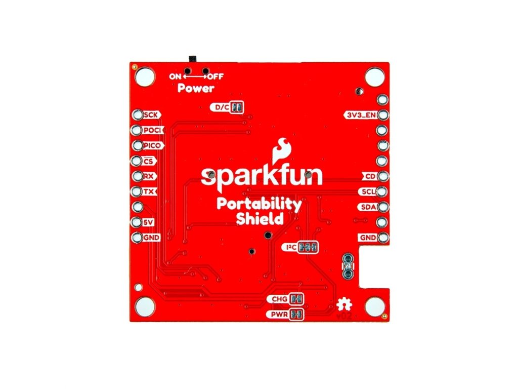 The SparkFun Portability Shield adds all the user interface bits needed to take a SparkFun development board into the field. A LiPo battery connector, charger, fuel gauge, and an on/off switch address your power needs. A friction-fit microSD connector allows for data logging. The 1.3in. OLED and a five-way navigation switch provide an excellent user interface. Locking 0.1in. headers along the shield's edge make it easier to solder male pins in place.
