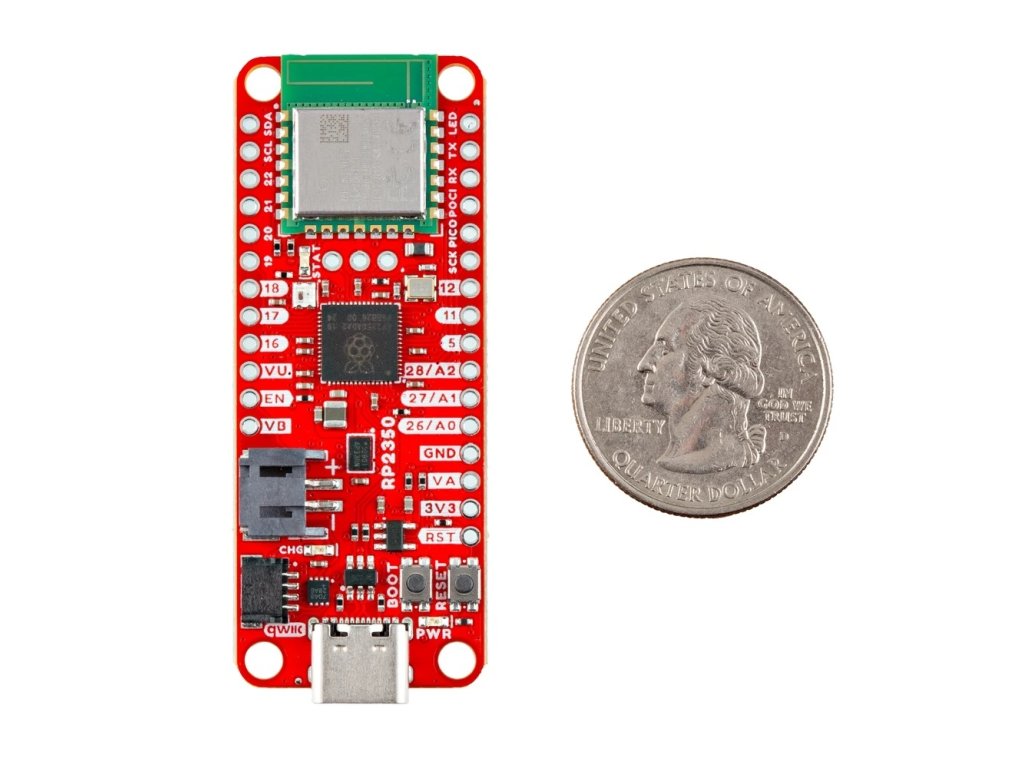 The SparkFun Thing Plus - RP2350 is a dynamic and powerful wireless development platform in the Thing Plus form factor. Built around the RP2350 microcontroller from the Raspberry Pi Foundation, this board includes their radio module for single-band 2.4 GHz WiFi 4 (802.11n) and Bluetooth® 5.2 along with standard hardware components found on all Thing Plus Boards. This includes on-board Lithium Ion (LiPo) battery charging and fuel gauge circuits, µSD card socket, Qwiic connector, and the Thing Plus pinout, allowing use of the RP2350 Thing Plus in a wide variety of both local and remote applications.