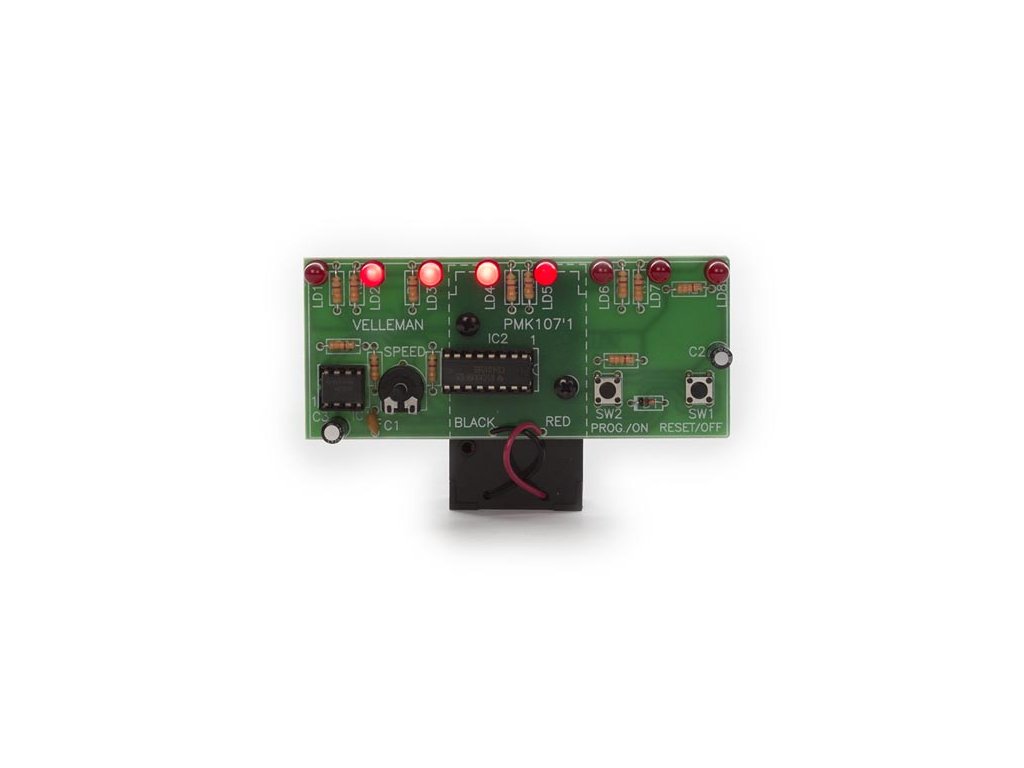 Stavebnica - Bežiace svetlo s LED WSL109 s LED diód. Rôzne prevádzkové efekty LED sú voliteľné (tlačidlo PROG). Nastaviteľná efektová rýchlosť (potenciometer SPEED). Tlačidlo pre pohotovostný režim (tlačidlo OFF).Technické údajeNapájanie: 9V batéria (nie je súčasťou balenia)Rozmery: 95 x 40mm