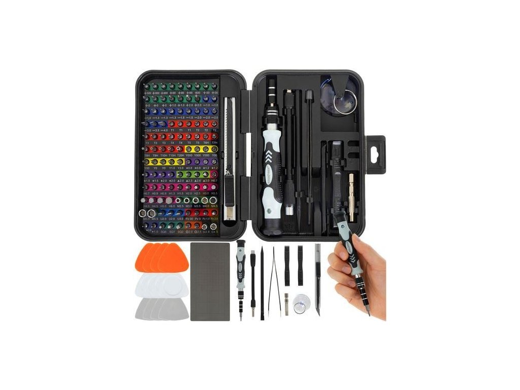 Profesionálna sada presných nástrojov obsahuje všetko potrebné na opravy elektroniky, mobilných telefónov, počítačov, notebookov, okuliarov, hodiniek, a ďalších jemných zariadení. Táto komplexná 133-dielna súprava vám umožní bezpečne a efektívne rozobrať a opraviť rôzne typy zariadení bez ich poškodenia.