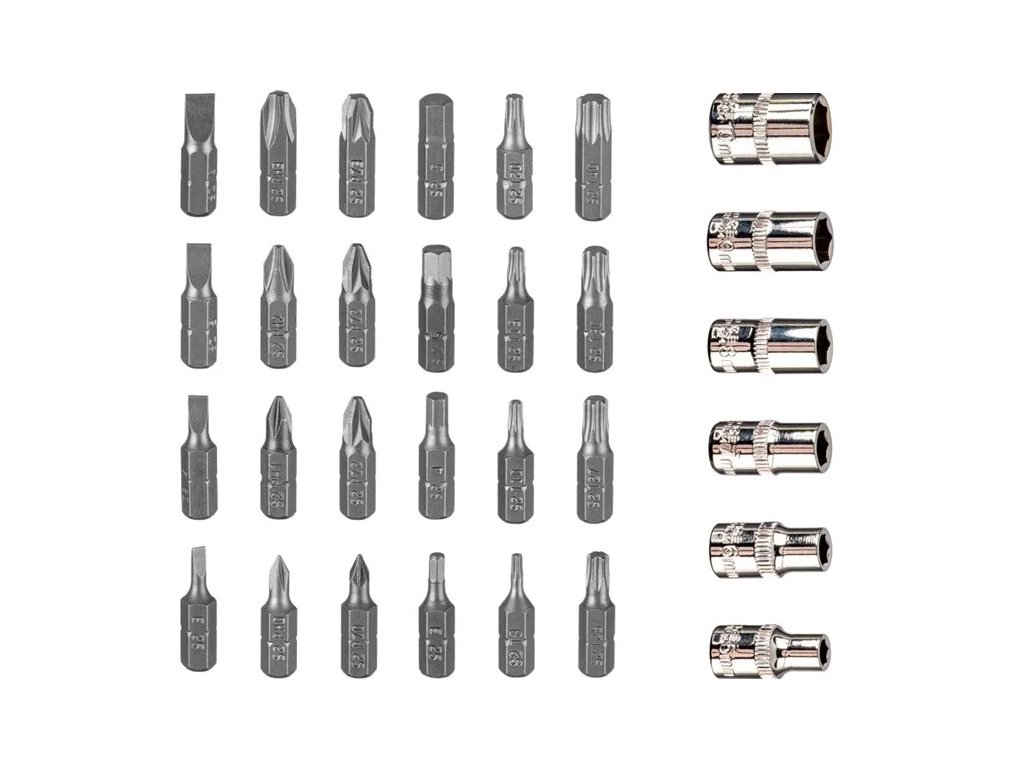 Obsahuje 1x adaptér pre nástrčné kľúče, 6x nástrčné kľúče (5-10 mm, CRV) a 24 bitov z nárazuvzdornej ocele S2: 4x ploché s drážkou, 8x krížové (PH, PZ), 4x šesťhranné (H), 8x šesťhranné.