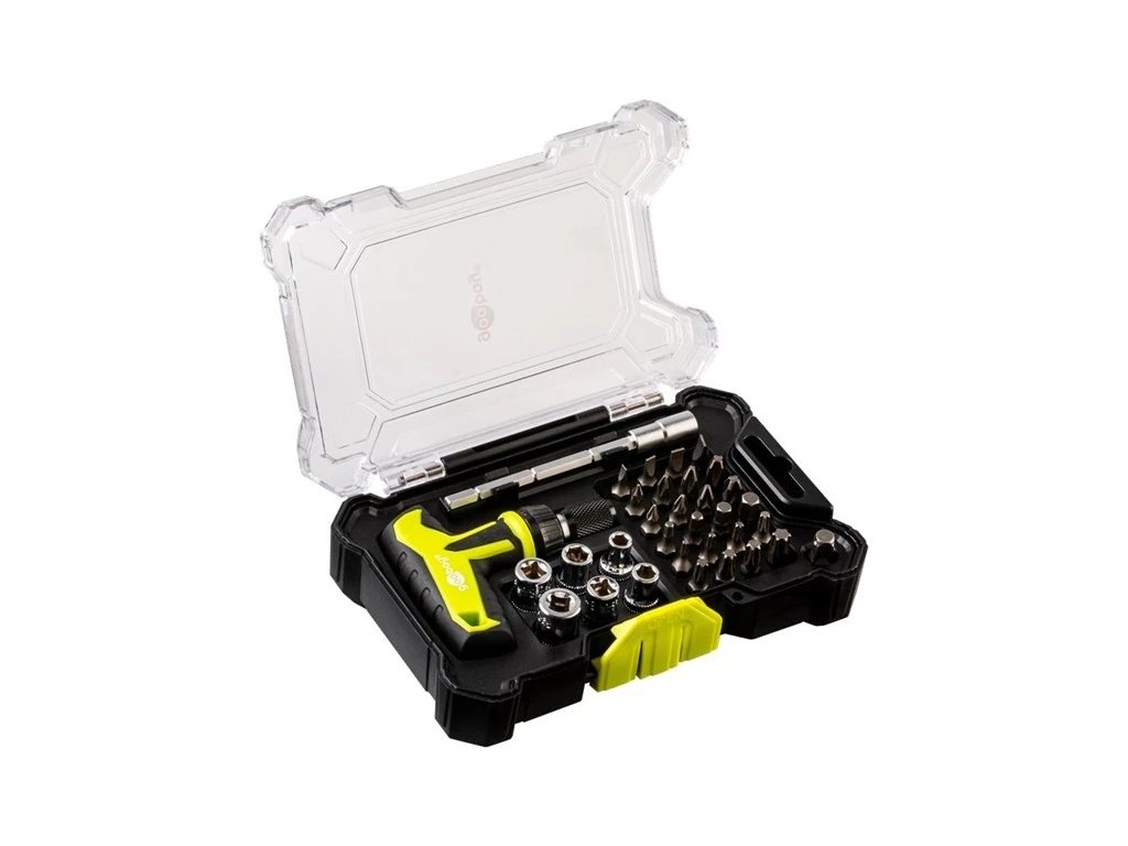 24 bitov, 6 nástrčných kľúčov, úložný box, predlžovacia sada bitov, rukoväť v tvare T pre skrutkovač, adaptér pre nástrčné kľúče