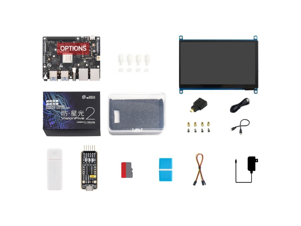 Táto sada obsahuje VisionFive2 (možnosti pre 4GB/8GB RAM), WIFI modul (voliteľné) a Starter Kit Accessories Pack, ktorý obsahuje UART modul, 32GB TF kartu, čítačku kariet, 3PIN kábel a 5V 3A Napájací zdroj typu C, ktorý používateľom pomáha rýchlo začať s VisionFive2 a vyvíjať systémy Debian a Buildrootfs za nízku cenu.