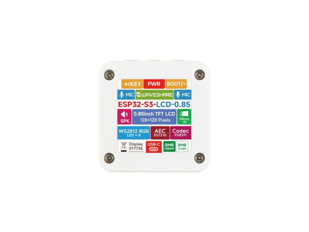 ESP32 -S3-LCD-0.85 je vývojová doska pre mikrokontrolér, ktorá podporuje 2,4 GHz Wi-Fi a Bluetooth BLE 5. Je vybavená na mieru tvarovaným štvorcovým plastovým puzdrom, ktoré ponúka kompaktný a prémiový vzhľad. Integrovaný 0,85-palcový farebný LCD displej IPS, slot pre TF kartu, 8 × priestorové RGB LED diódy, nízkoenergetický audio kodekový čip atď. umožňuje pohodlný vývoj multimediálnych a interaktívnych aplikácií. Vďaka týmto hardvérovým zdrojom tento produkt podporuje funkcie, ako je zobrazovanie obrázkov, prehrávanie zvuku a ovládanie svetelných efektov, vďaka čomu je vhodný na rýchle prototypovanie a integráciu do koncových produktov pre prispôsobené rozšírenie a sekundárny vývoj.